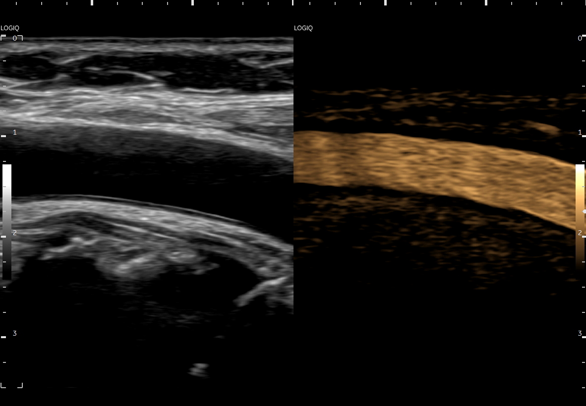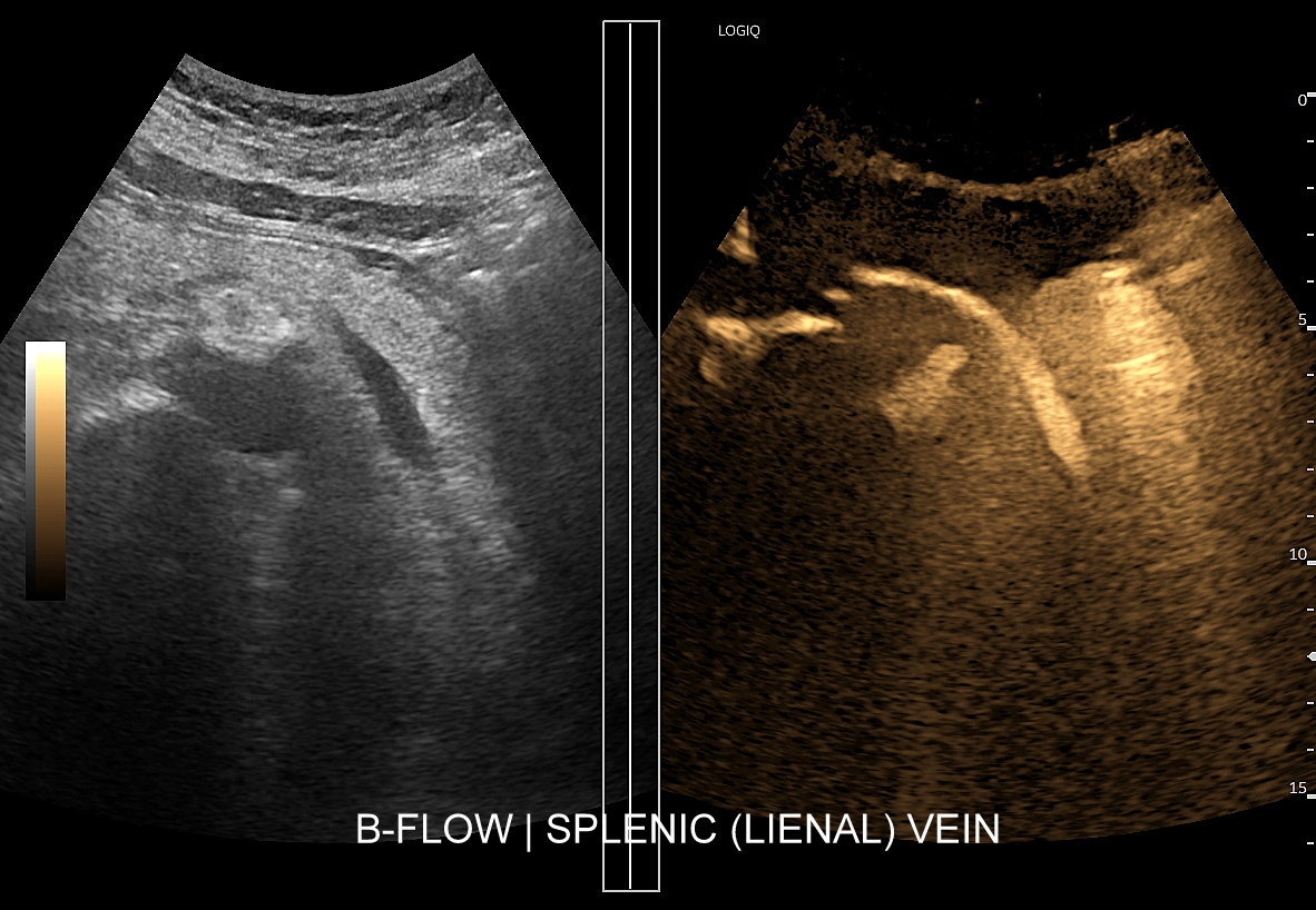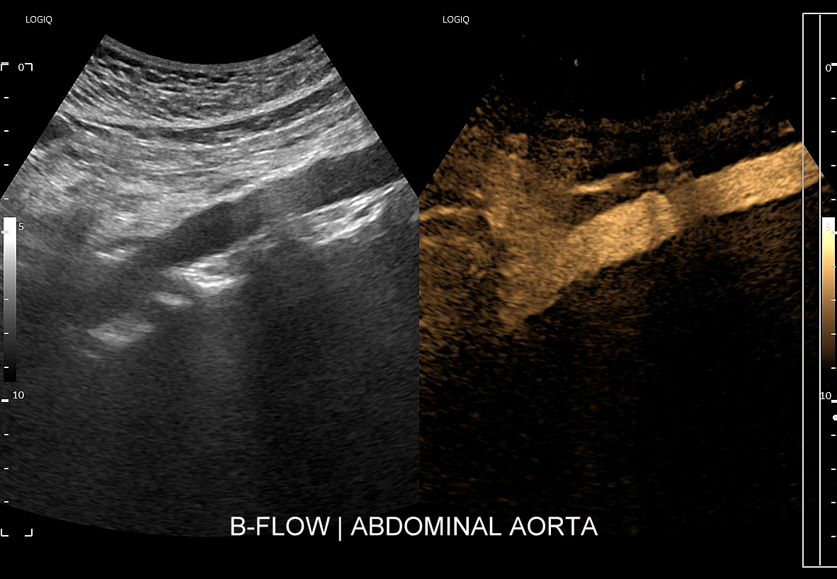 Podsumowując, omawiany tryb B-flow jest prostą w zastosowaniu modalnością USG, która poprawia i uzupełnia w urządzeniach firmy GE obrazowanie zarówno podstawowego trybu w skali szarości (B-mode), jak i naczyniowe tryby typu color-Doppler, czy power-Doppler. Charakteryzuje się przy tym mnogością różnorodnych zastosowań.