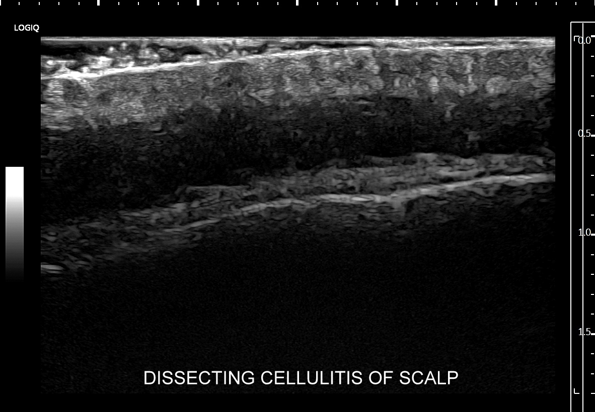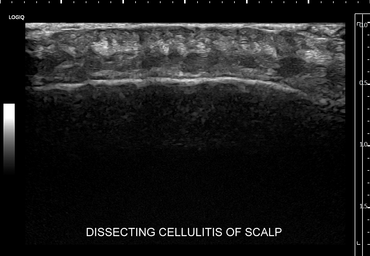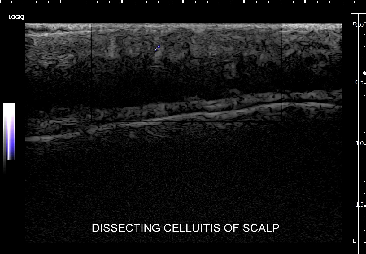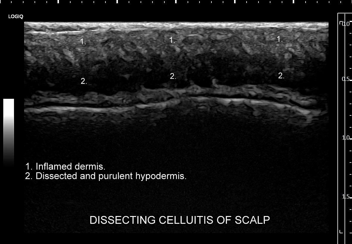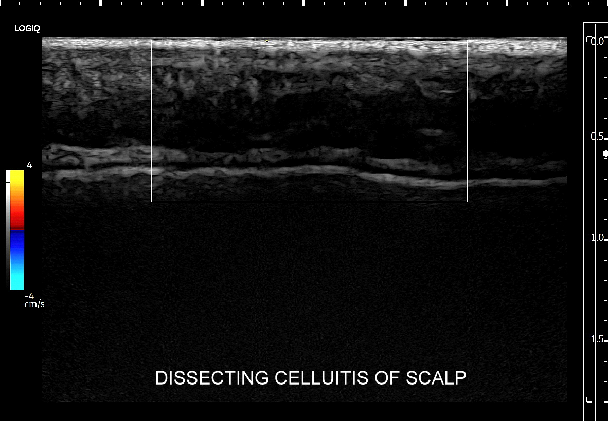 Seria USG w 5 minut! Choroba określana w literaturze angielskiej jako dissecting cellulitis of the scalp (DCS), w bezpośrednim tłumaczeniu na język polski oznaczająca rozwarstwiające zapalenie tkanki podskórnej skóry owłosionej głowy, znana także pod synonimem choroba Hoffmana, jest przewlekłą chorobą zapalną powłok owłosionych głowy wywodzącą się z mieszków włosowych. Dokładna etiopatogeneza schorzenia nie jest poznana. Postuluje się, iż z powodu nieznanego defektu dochodzi do masowego blokowania mieszków włosowych, które pod wpływem gromadzącej się wydzieliny pęcznieją i pękają podskórnie, poczym dochodzi do wytworzenia się zapalenia i licznych mikroropni w tkance podskórnej, które to następnie łączą się, tworzą liczne przetoki podskórne, aż w końcu zlewają się w tkance podskórnej w jeden duży, rozwarstwiający pokład ropy. W sprzyjających warunkach może on ulec nadkażeniu bakteryjnemu. Przewlekły proces zapalny oraz wtórne zmiany w postaci bliznowacenia są przyczyną wtórnego łysienia.