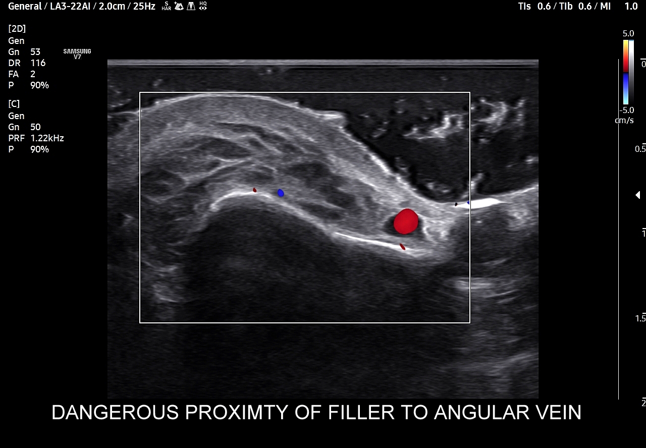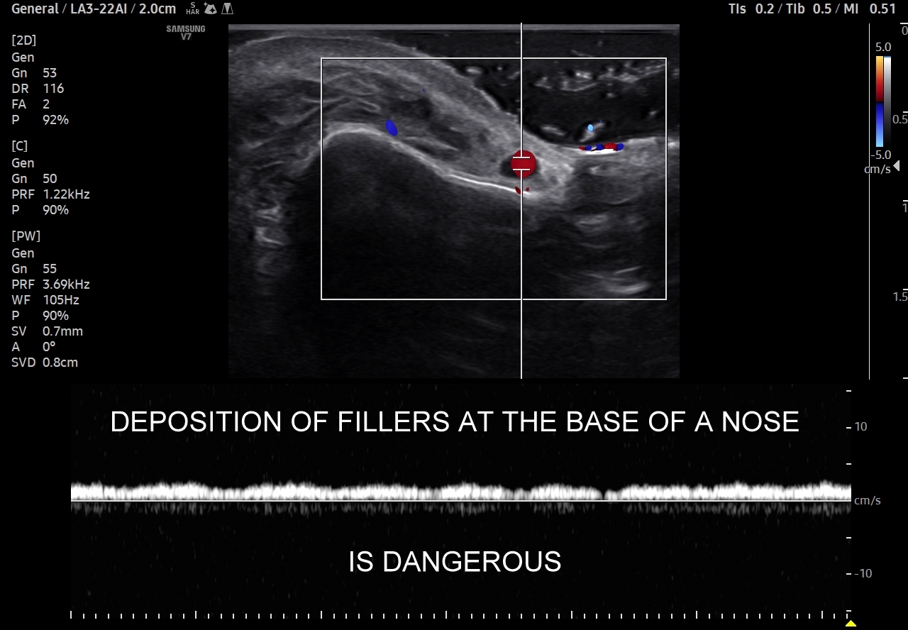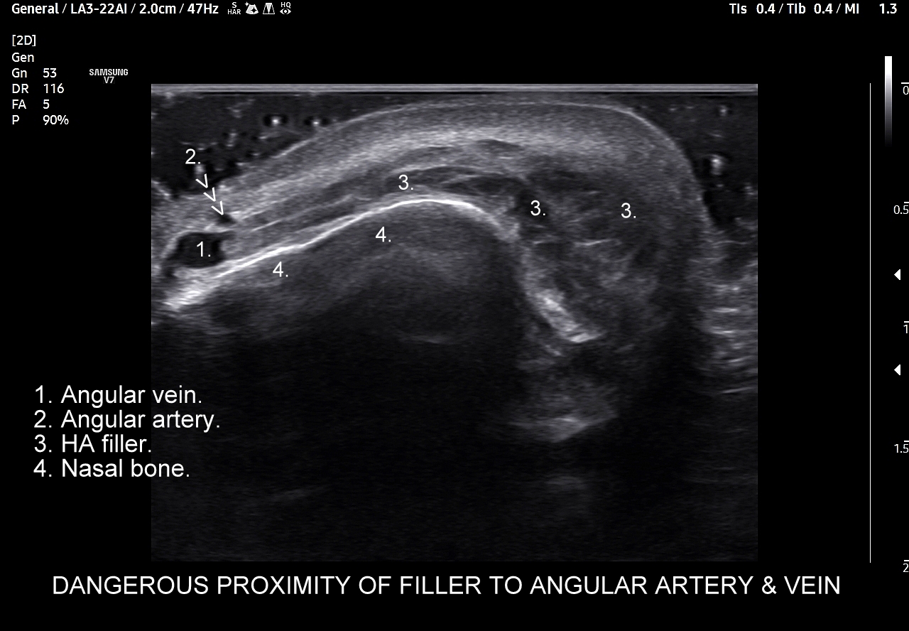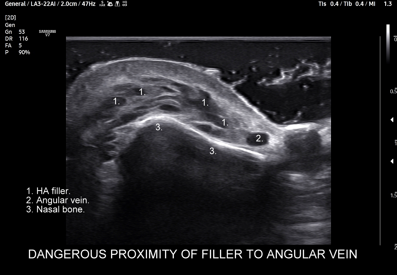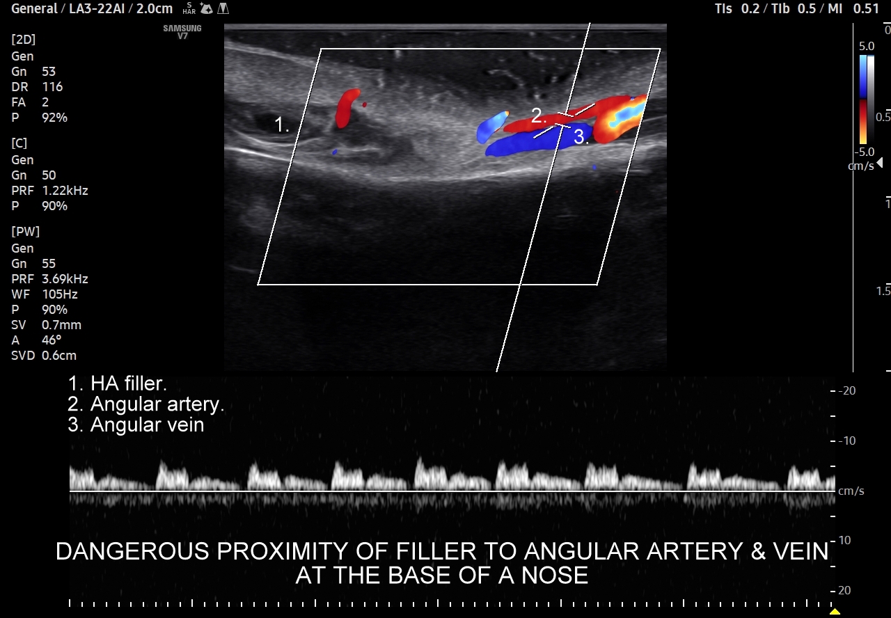 Należy również podkreślić, iż ze względu na gęste upakowanie naczyń, bezpośrednią bliskość anastomoz i często obecność szerokiej, acz niewidocznej żyły kątowej szczególnie niebezpiecznym w aspekcie deponowania wypełniaczy czy wystąpienia lokalnych stanów zapalnych jest obszar u nasady nosa, przy wewnętrznych kącikach oczu i na gładzinie (łac. glabella). Na załączonych do artykułu skanach zobaczyć można czym jest trójkąt śmierci na twarzy i na tej podstawie uzmysłowić sobie, dlaczego tak właśnie się nazywa. Proszę zwrócić uwagę na przykład ekstremalnej bliskości nieodpowiedzialnie zdeponowanego u podstawy nosa wypełniacza, tu kwasu hialuronowego, w stosunku do struktur naczyniowych.