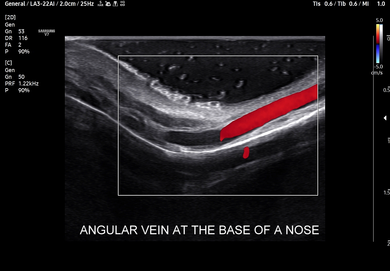 Seria USG w 5 minut! Trójkąt śmierci na twarzy (ang. triangle of death, danger triangle of the face) to trójkątny obszar, którego granice w przybliżeniu wyznaczają kąciki ust i szczyt nasady nosa, a w którego obrębie występuje bogate oraz przede wszystkim specyficzne unaczynienie. Otóż naczynia w tej części twarzy, zarówno tętnice, jak i żyły, posiadają liczne anastomozy ze strukturami wewnątrzczaszkowymi.
