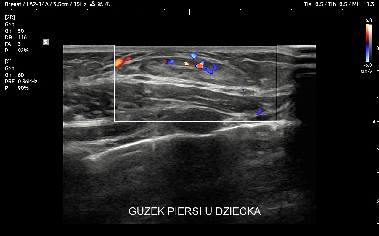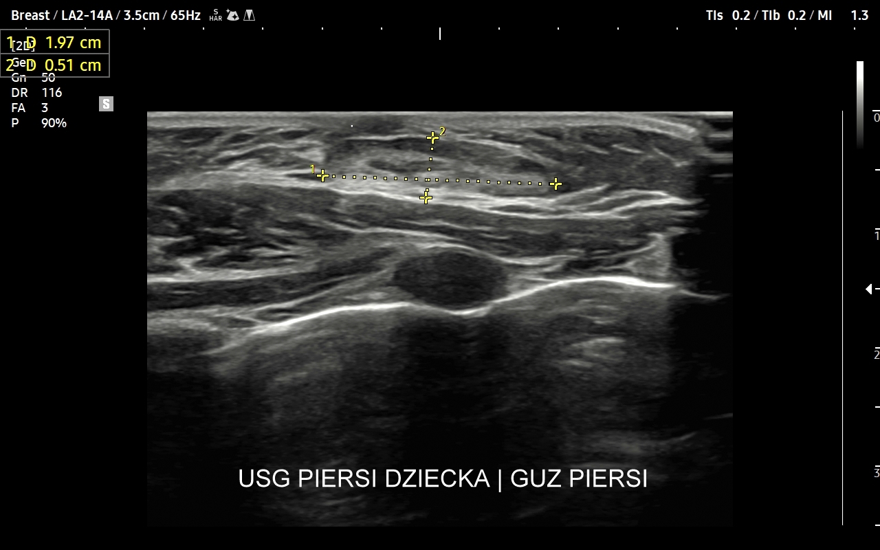Najczęstszym wskazaniem do badania gruczołu piersiowego u dziewczynek jest stwierdzenie przedwczesnego dojrzewania płciowego (ang. precoxious puberty), inaczej pokwitania,  w tym przedwczesnego rozwoju gruczołów piersiowych (łac. thelarche praecox), które jest najczęstszą formą przedwczesnego pokwitania. Badanie USG jest w takiej sytuacji częścią diagnostycznego postępowania endokrynologicznego. W rzadszych przypadkach powiększenia gruczołów piersiowych u dzieci znajdowane są guzy lite, np. tłuszczako-włókniaki.