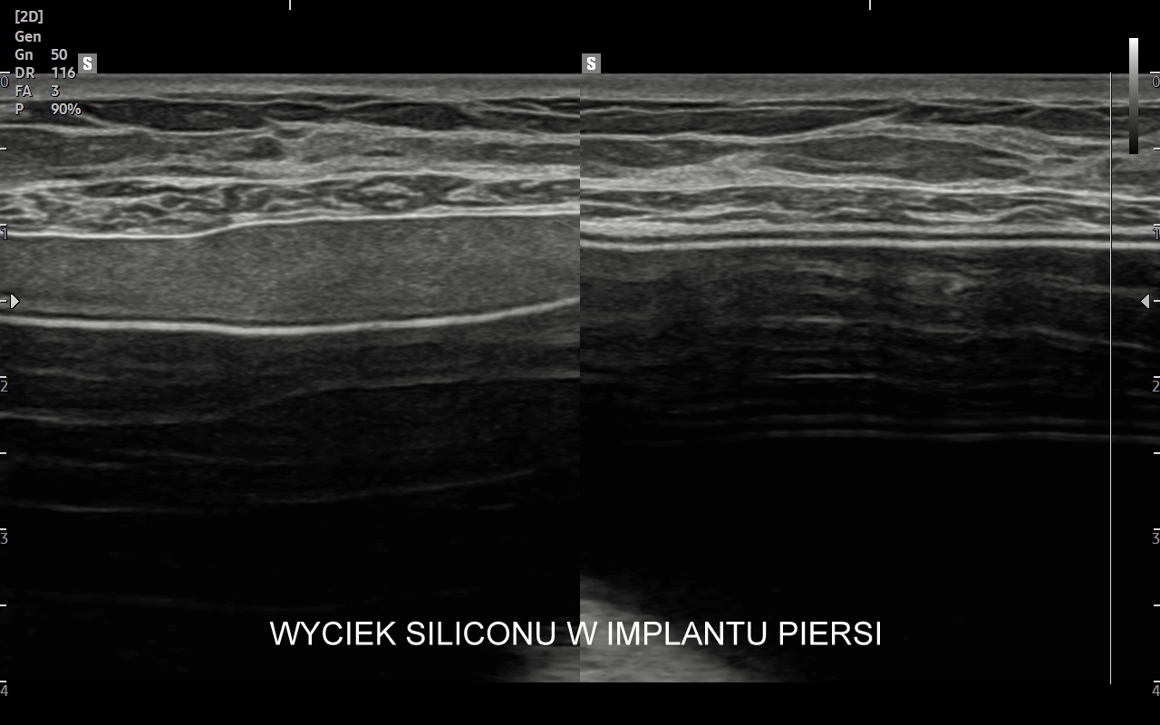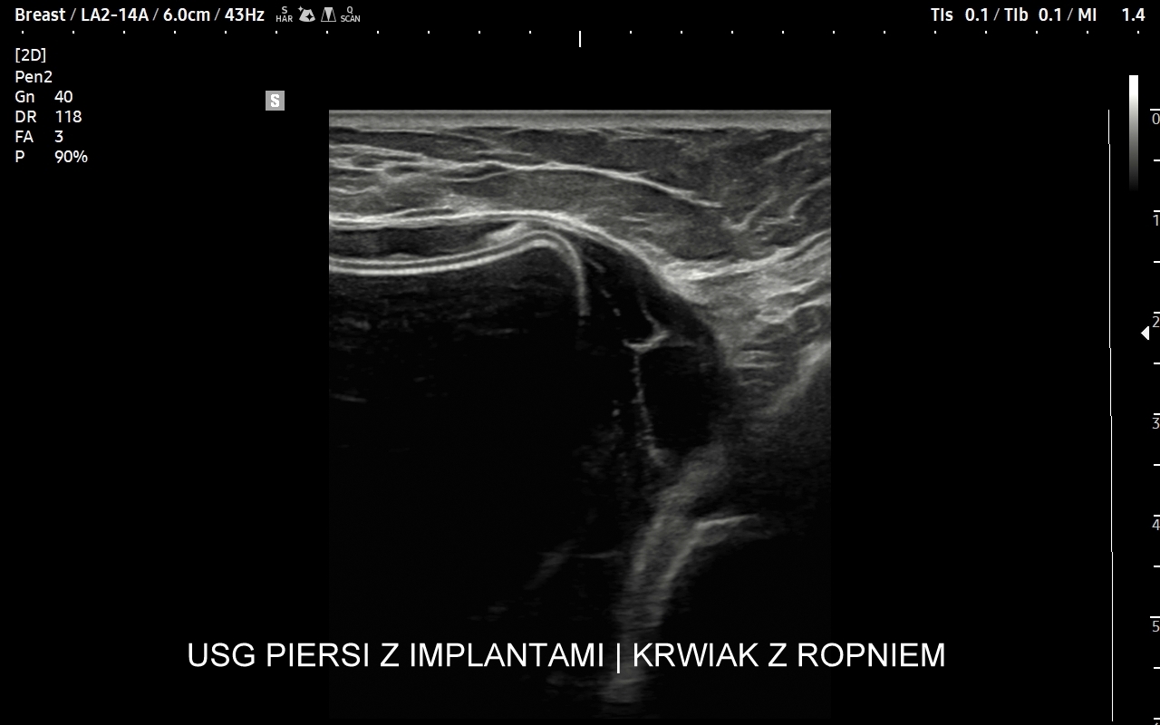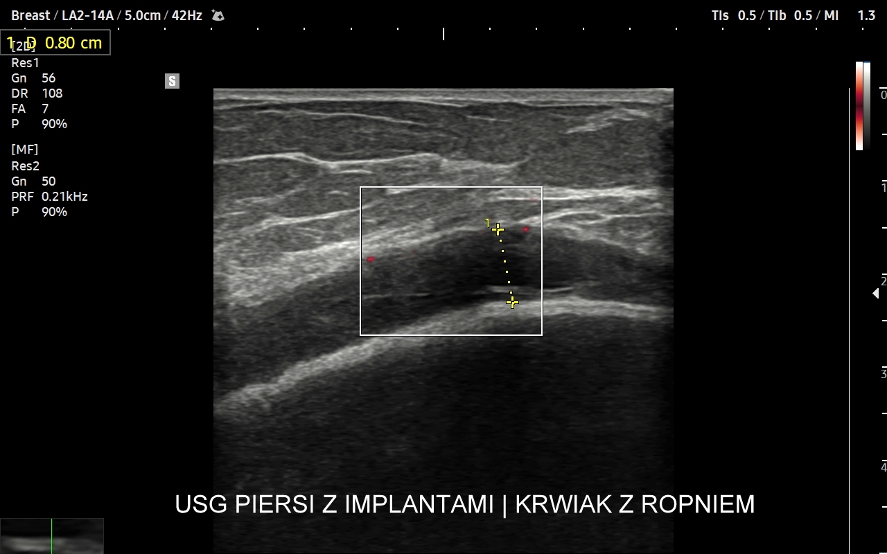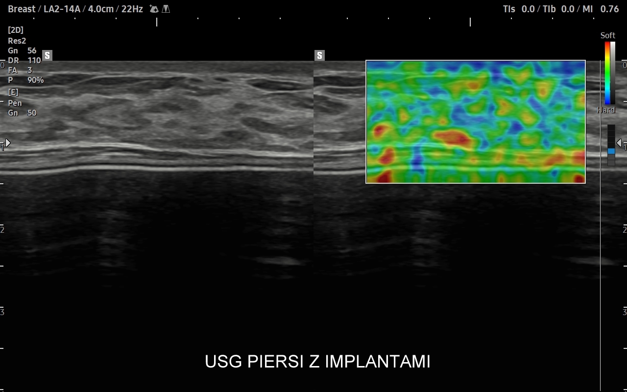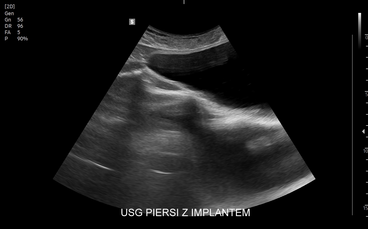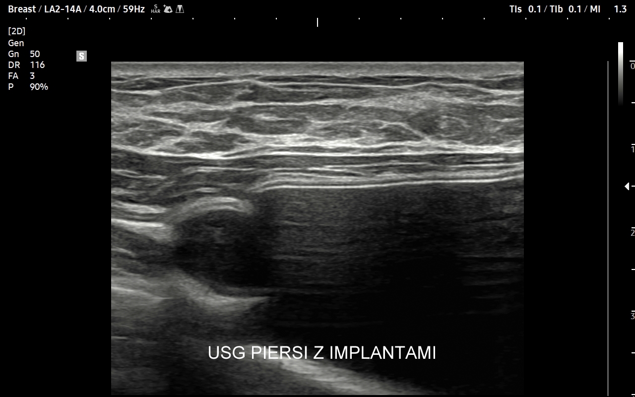 Badanie USG piersi z implantami jest szczególną procedurą diagnostyczną. Przeprowadza się ze wskazań wcześniej opisanych, jak w przypadku piersi bez implantów, ale także w schorzeniach ściśle związanych z implantem. Przykładami są powikłania chirurgiczne takie jak przemieszczenie się implantu, krwiak, ropne zapalenie tkanek wokół implantu, jego pęknięcie, a także wystąpienie chłoniaka BIA-ALCL (ang. breast implant associated anaplastic large cell lymphoma) jako odległego powikłania wszczepienia implantu piersi.