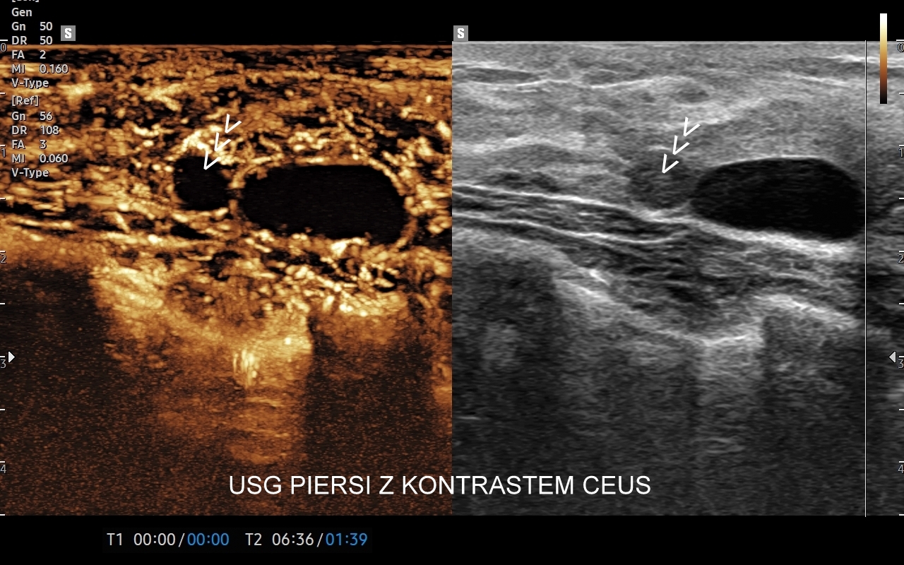 Badanie USG piersi z kontrastem (CEUS) jest najnowszą metodą diagnostyczną piersi i rozwinięciem badania multiparametrycznego USG (MPUS). Główną rolą badania CEUS piersi jest zwiększenie precyzji oceny guzków piersi pod kątem kwalifikacji w skali BIRADS, a przez to uniknięcie niepotrzebnych biopsji piersi. W przeciwieństwie do innych metod diagnostycznych zasadniczą zaletą badania CEUS jest możliwość jednoznacznego wykazania lub wykluczenia unaczynienia guzka piersi. Podejrzany guzek, którego unaczynienia lub cech nie można jednoznacznie ocenić w standardowym badaniu USG można poddać badaniu USG z kontrastem. Otóż w przypadku, gdy zmiana nie posiada unaczynienia to nie jest ona nowotworem. Niezależnie od kwalifikacji guzków łagodnych badanie CEUS ma możliwość w wielu wypadkach uwidocznienia ukrytych dodatkowych cech świadczących o złośliwości guzka.