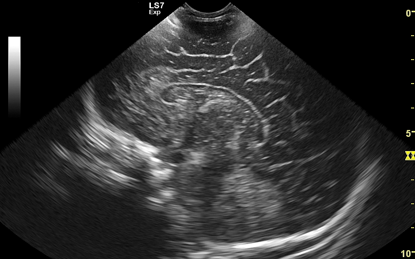 Badanie USG służy również ocenie dojrzałości mózgowia dziecka; otóż mózg wcześniaka różni się od mózgu starszego niemowlęcia. U tego pierwszego obserwuje się m. in. mniej zaawansowane bruzdowanie kory mózgowej oraz warianty rozwojowe, z których najczęstszym jest jama przegrody przezroczystej. Zaburzenia rozwoju kory mózgowej u płodu, a potem u niemowlęcia, obserwowane są w przypadku palenia papierosów przez ciężarną lub spożywania przez nią alkoholu, w przypadku powikłań przebiegu ciąży, a także powikłań okołoporodowych.