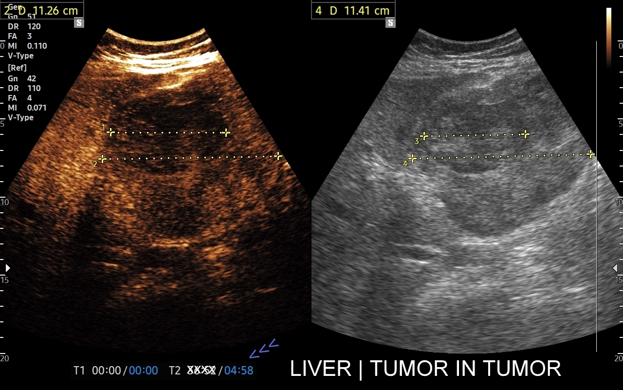 Badanie USG z kontrastem najczęściej wykorzystuje się do oceny zmian ogniskowych w wątrobie, potocznie nazywanych guzami wątroby, z których wiele ma na tyle specyficzny obraz mikrounaczynienia w obrazowaniu CEUS, że możliwe jest uniknięcie konieczności badania obciążającymi metodami TK lub MRI. Badanie CEUS w przeważającej większości pozwala odpowiedzieć, czy zmiana ogniskowa wątroby ma cechy złośliwe czy łagodne. Dodatkowo CEUS jest pomocny do wykrywania przerzutów do wątroby pochodzących z nowotworów w innej lokalizacji. W przypadku przerzutów o wielkości mniejszej niż 1 cm CEUS ma większą czułość aniżeli badanie TK.